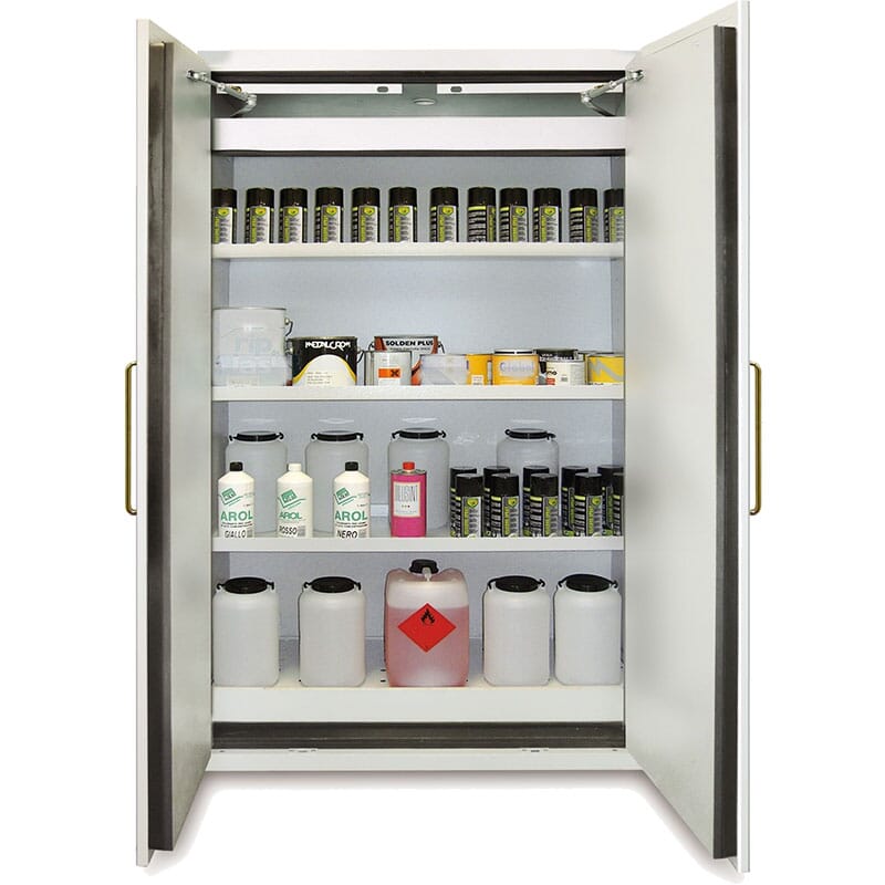 BRANNSIKKERT KJEMIKALIESKAP, 90P - CSF 232-90Brannsikrede skap (90 min) for oppbevaring av farlige (lettantennelige) kjemikalier.3 sikrede regulerbare lastehyller og 1 bunnoppsamler.