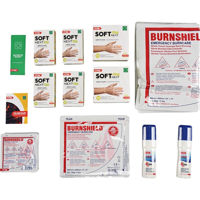 Innholdsrik brannskadekoffert for behandling av brannskader.