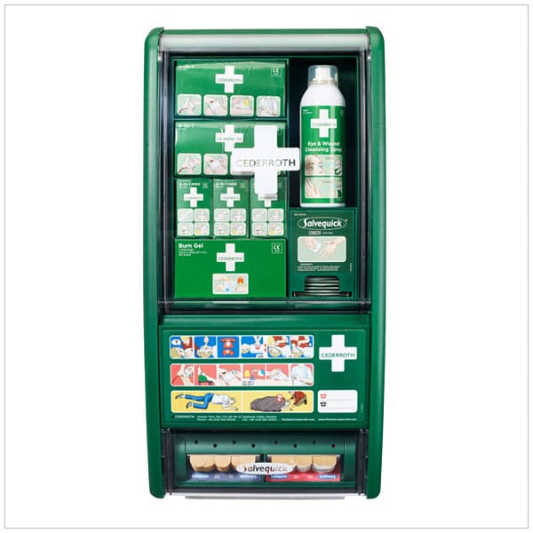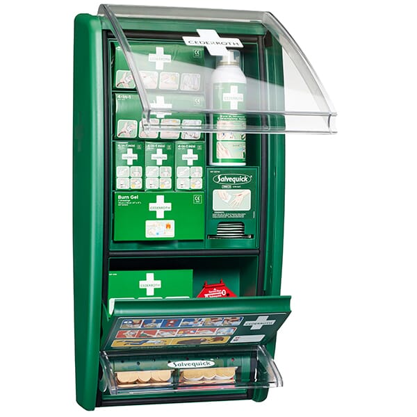 Førstehjelpsstasjonen er delt inn i 3 seksjoner. Øverste og nederste seksjon inneholder plaster, bandasjer og beskyttelsesutstyr til daglig forbruk og beredskap. Et transparent lokk og en gummilist beskytter produktene mot støv og smuss. Den midtre seksjonen består av et ekstra rom for lagring av påfyllings- og supplerende førstehjelpsprodukter. Stasjonen har tydelige piktogrammer som viser riktig førstehjelpsinstruksjon. Eget felt for nødnummer.