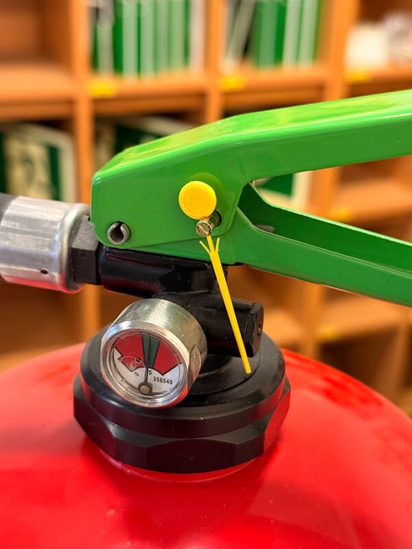 Stikkplombe for brannslukkere med sikringspinner med hull i enden. Kan enkelt fjernes ved å trekke ut sikringspinnen eller dra vekk hodet på plomberingen.
